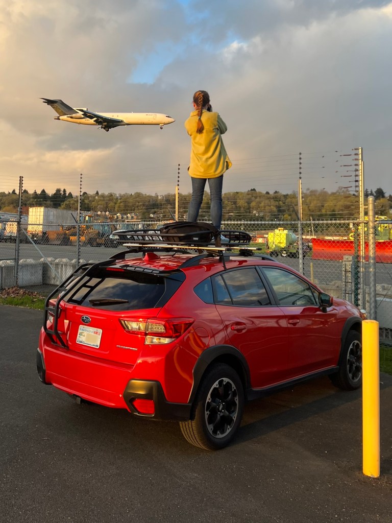 In fall 2020, Scott and I came to the difficult realization that we seriously needed to consider buying a new car. Littler had been in and out of the shop, and it was no longer practical to keep fixing the seemingly endless issues that were popping up. In choosing our next vehicle, I had only one requirement: it had to be bright red to carry on the legacy of Little Red and Littler. We found a 2021 Subaru Crosstrek as bright as a brand new fire engine, and immediately knew it was the one. This car was the biggest of the three, so naturally, we just called her, “Red.” I love that car to pieces as it was our first “big purchase” as a couple and it is such a big part of our lives today — I drive it to and from work, Scott drives it all over the state to go hiking, and I climb atop it to get the best vantage point when taking photos at local airports.